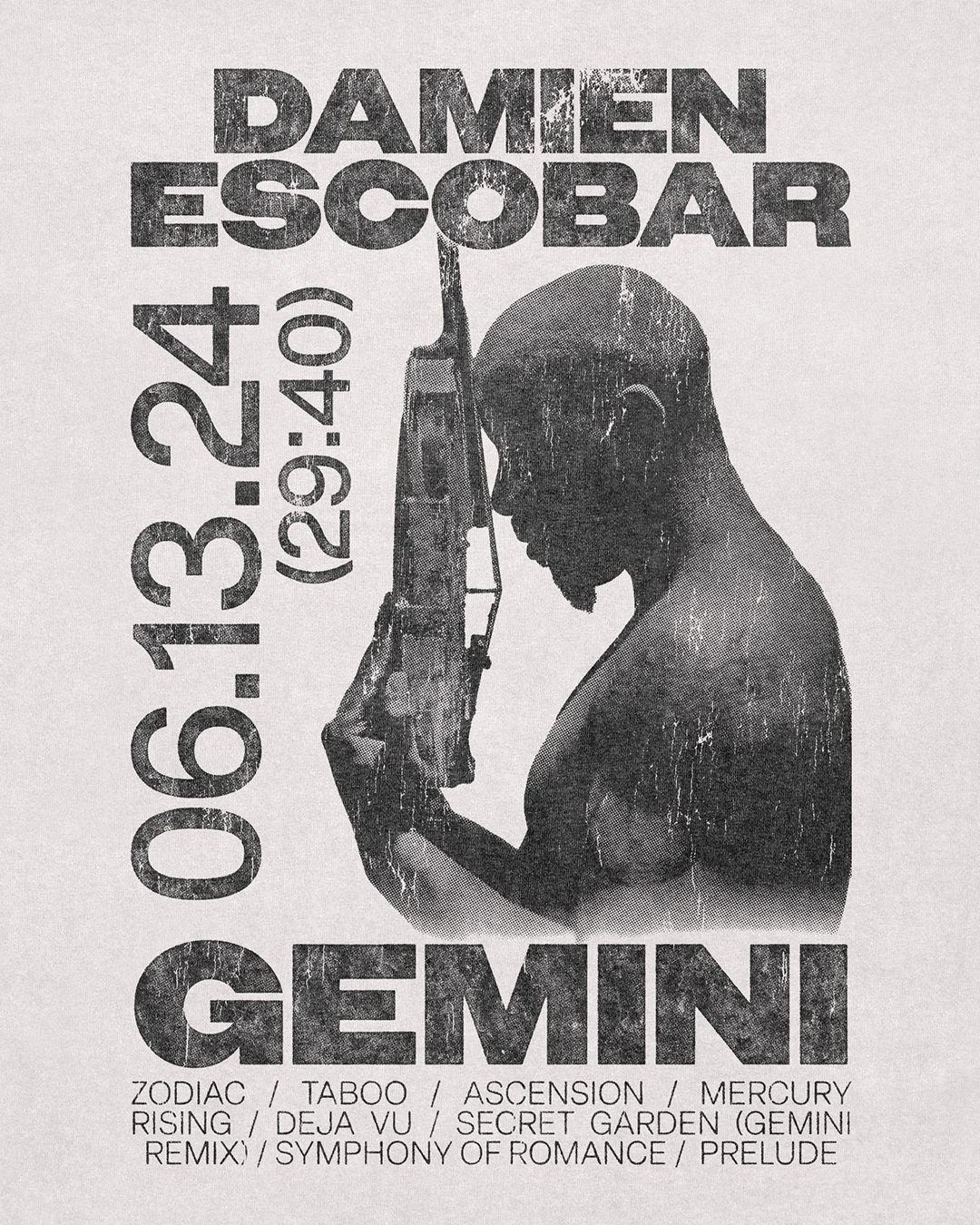 Design of merchandise and visual identity elements for Damien Escobar’s “Gemini Tour” – a concert series supporting the promo of the Gemini album. The designs reinterpret the album’s original visuals, incorporating custom typography and a fresh graphic direction. Merchandise is available at tour stops and soon via Damien Escobar’s official webshop.